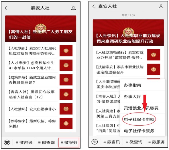 通过手机申领失业补助金的前提是先开通电子社保卡,首先,介绍一下如何开通电子社保卡。手机微信搜索、关注“泰安人社”微信公众号,进入“泰安人社”公众号界面,在“微服务”栏目选择“电子社保卡申领”服务,内容包含通过“泰安人社APP”、“支付宝”、“微信”等方式申领电子社保卡的攻略,按照操作说明开通电子社保卡。