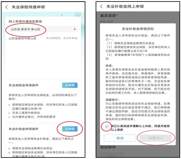 第四步,“网上申领开通地区查询”中可查询已开通网上申领的地区、市、县,查看“失业补助金申领条件”,点击“去申领”;在申请须知中,勾选、点击同意;