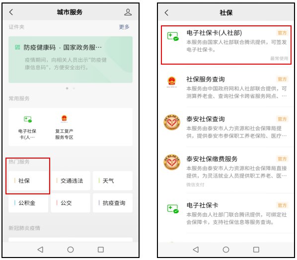 第二步,选择热门服务中“社保”服务,进入“社保”界面,选择“电子社保卡(人社部)”;