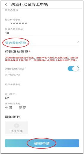 第五步,正确填写参保地(请选择最后一次失业保险参保地)、手机号码、核对社保卡银行账户,提交申请,等待审核并可查看审核结果。