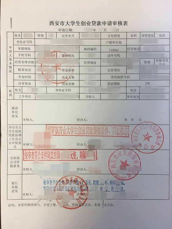 1.《西安市大学生创业贷款申请审核表》一式五份;