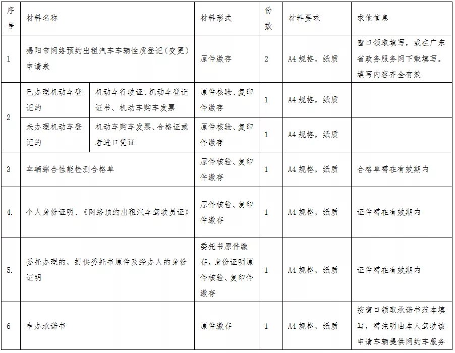 经审核通过的,1个工作日内在《揭阳市网络预约出租汽车车辆使用性质登记(变更)申请表》加具意见,并将审核结果告知申请人,提醒申请人在5个工作日内到公安交警部门办理车辆使用性质登记或变更为“预约出租客运”。审核不通过的,告知申请人不通过原因。