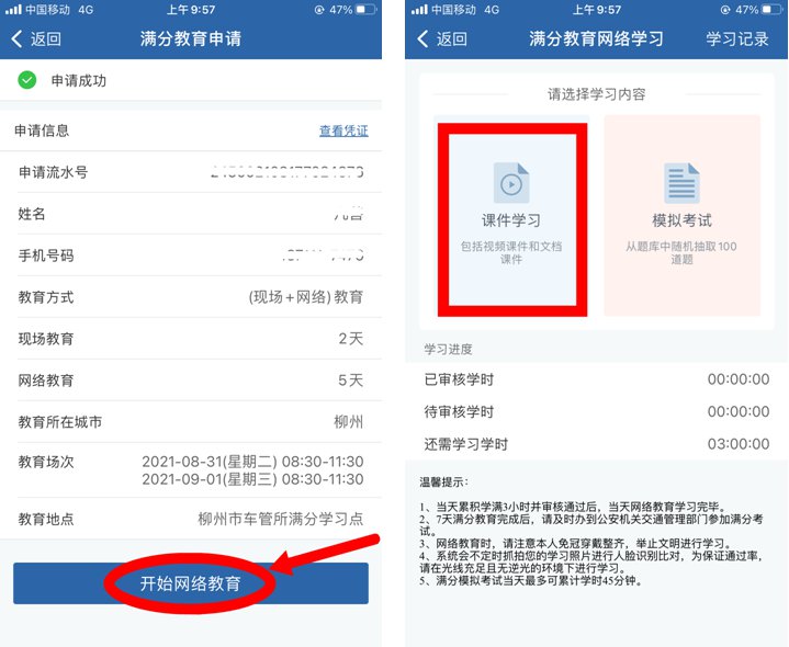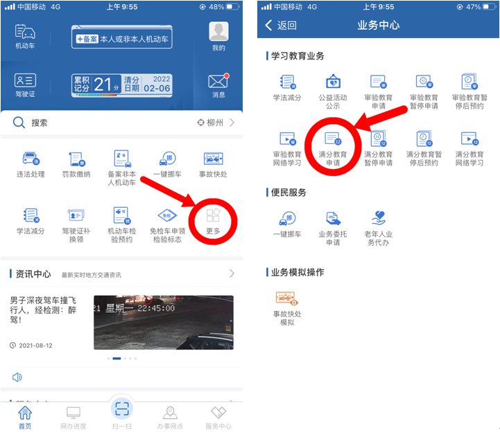目前,在网上有两种方式申请满分教育学习,申请人可以通过“交管12123”手机APP或者登录广西交通安全综合服务管理平台。