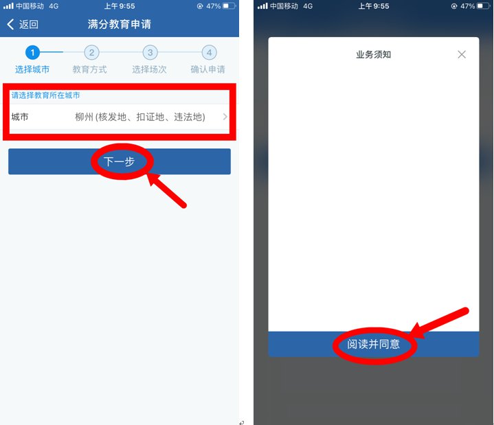 2、进入【选择城市】页面,教育所在地:“柳州”(核发地、违法地)点击“下一步”→【业务须知】点击“阅读并同意”;