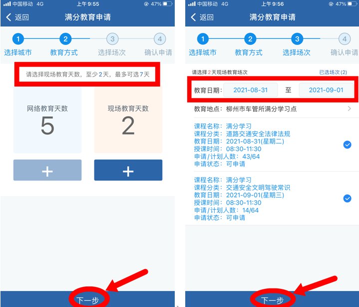 3、进入【教育方式】页面,选择网络教育天数和现场教育天数(根据驾驶证记分的不同情形,由系统自动计算现场教育天数)点击“下一步”→ 进入【选择场次】页面,选择教育日期,选择场次,点击“下一步”;