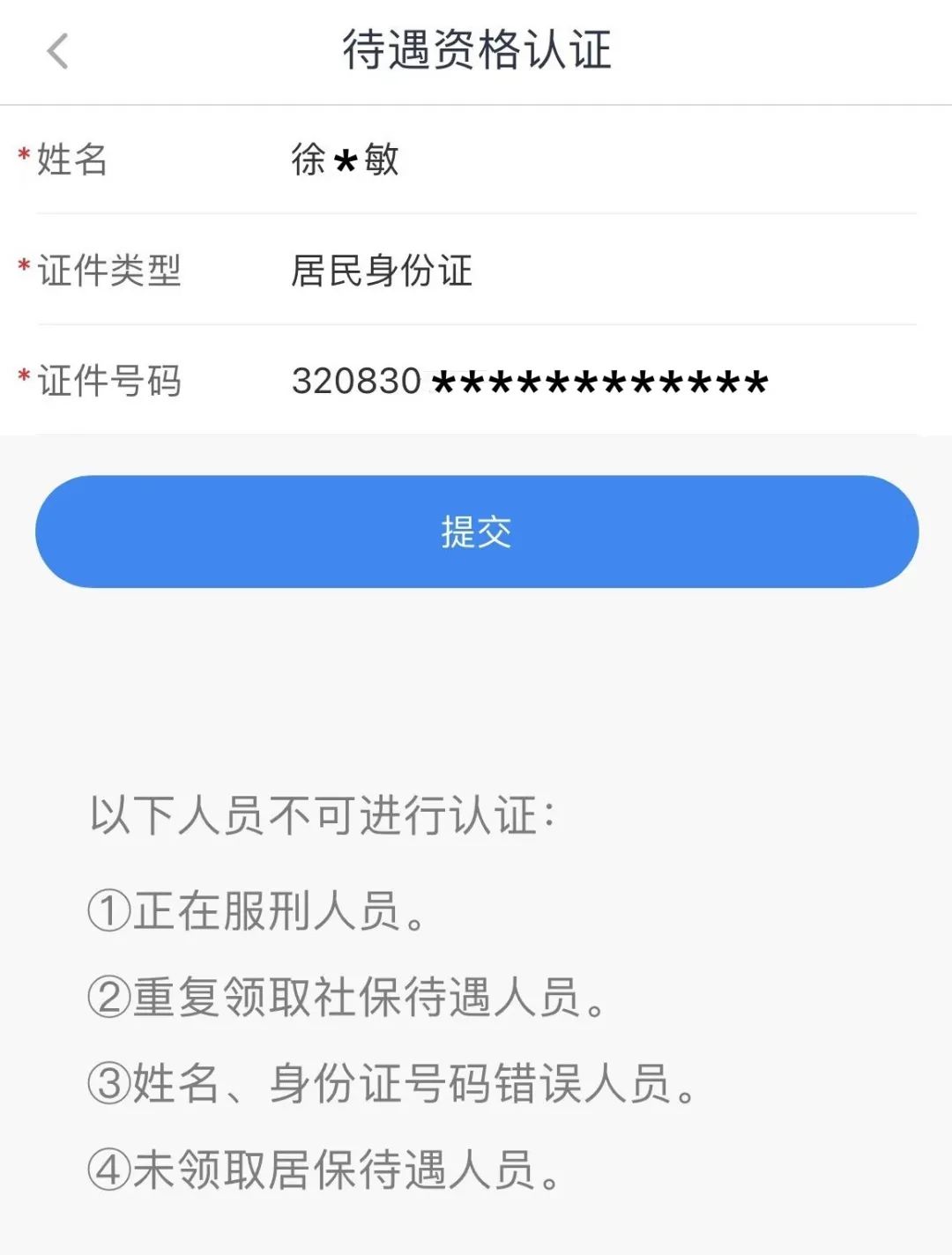 第四步:录入姓名和身份证号码,确认无误后提交。