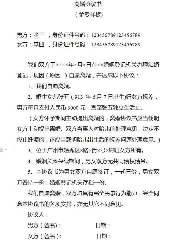 3.女方怀孕期间主动提出离婚的,离婚协议书应当载明女方主动提出离婚、双方当事人对胎儿的处理意见。决定不终止妊娠的,还应当载明胎儿出生后的抚养问题处理意见。