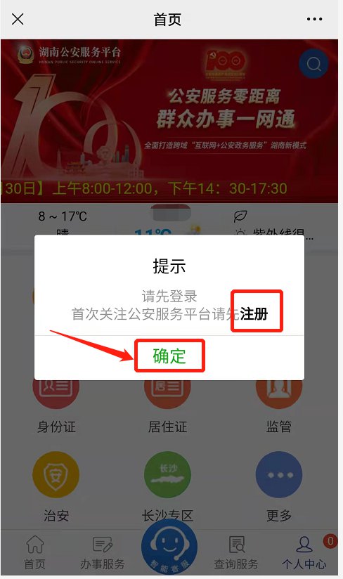 第一步:点击申请入口进入后扫描二维码,进入到湖南公安服务平台公众号,在首页点击【微警务】→【个人中心】,注册登录;(或直接微信搜索公众号“湖南公安服务平台”进行关注)。