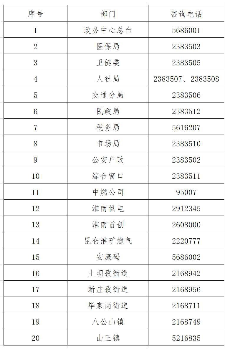 八公山区便民服务电话:
