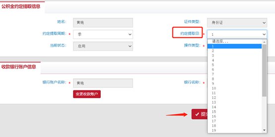 第七步:在【约定提取日】中修改日期后,点击【提交】按钮,完成提取日期的修改。