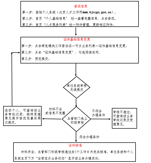 持有效期内《北京市工作居住证》的申请人,若证件基础信息(现居住地址、民族、婚姻状况、政治面貌、户籍地址、学历学位或专业技术职称等教育经历、学习经历、工作经历等)发生变更,可提交办理该业务(备注:姓名、性别、联系电话、证件类型、证件号码等信息均由北京市统一身份认证平台提供,如需变更,请联系北京市统一身份认证平台进行修改)。