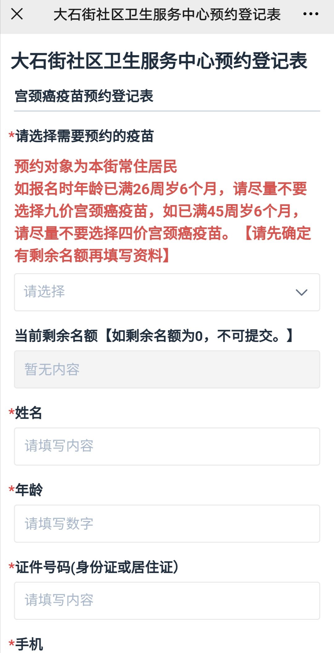 注意:目前仅接受大石街居住3个月以上的常住居民预约,暂不接受大石街外的居民预约。