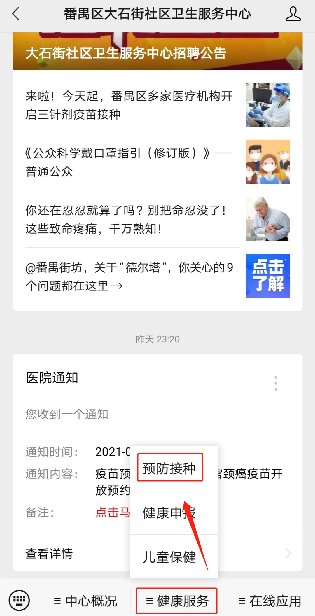 第一步:关注并进入“番禺区大石街社区卫生服务中心”微信公众号;