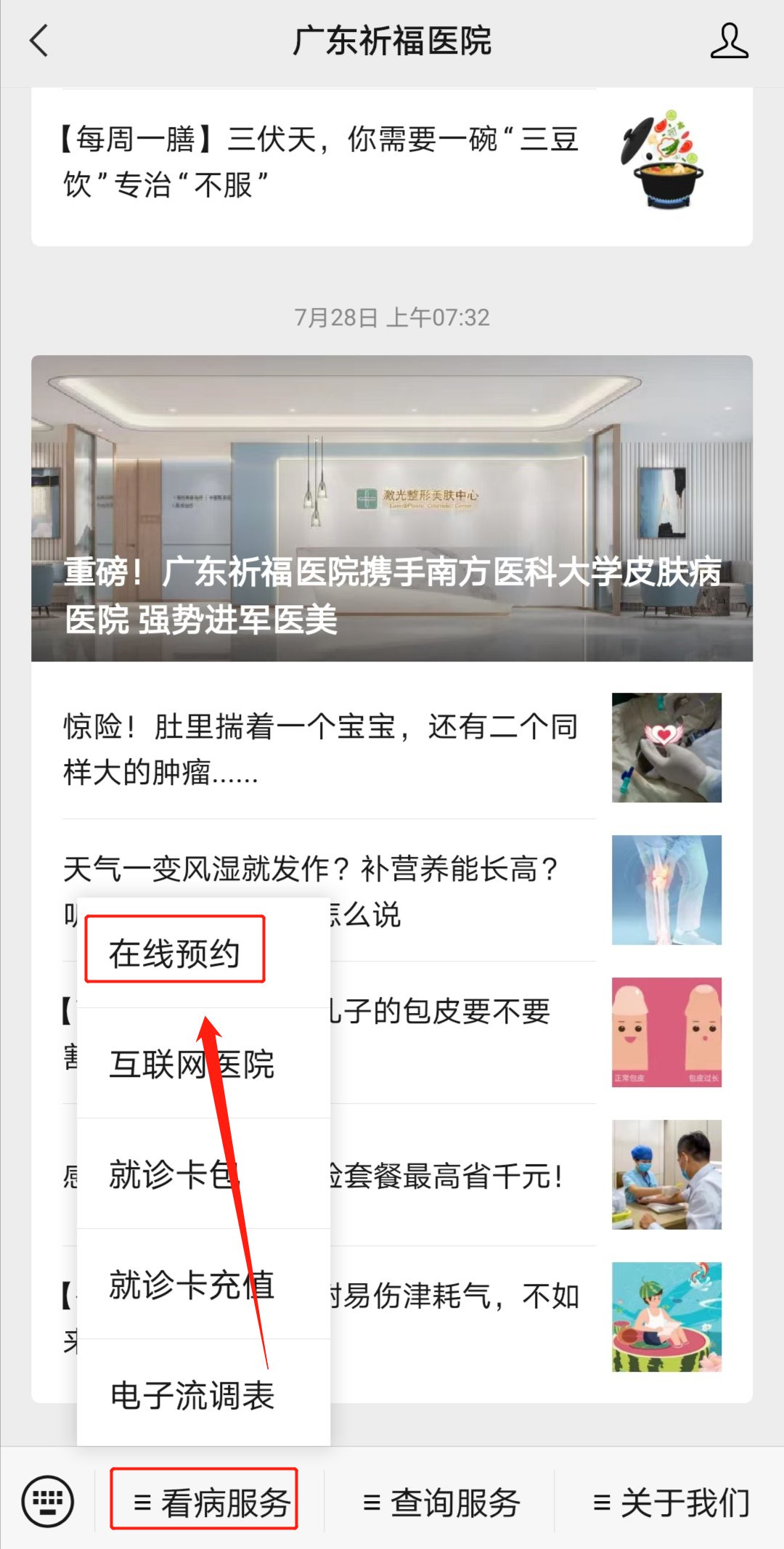第一步:关注“广东祈福医院”微信公众号,点击“看病服务”--“在线预约”;