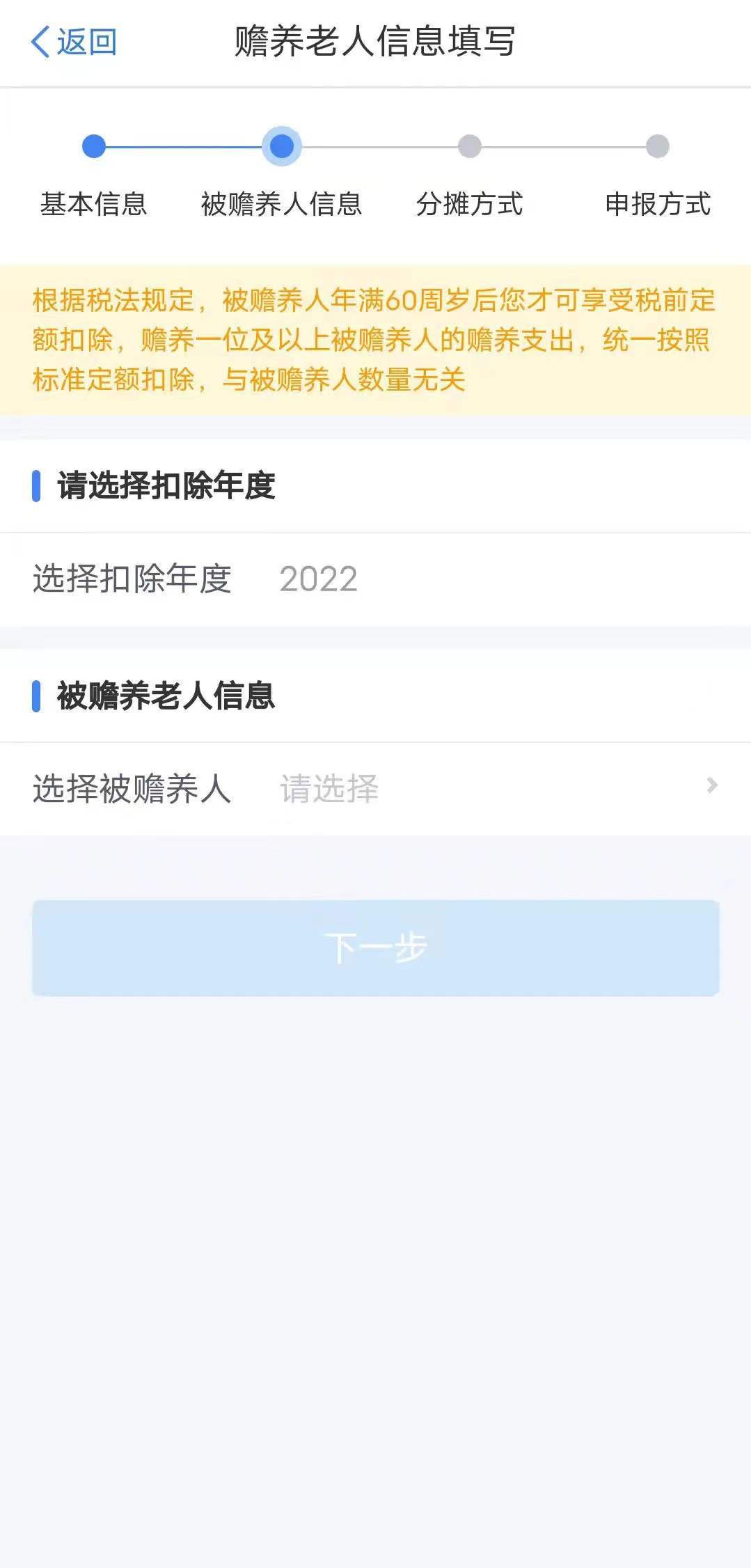 5、点击“选择被赡养人”,填写被赡养老人信息后,点击“下一步”