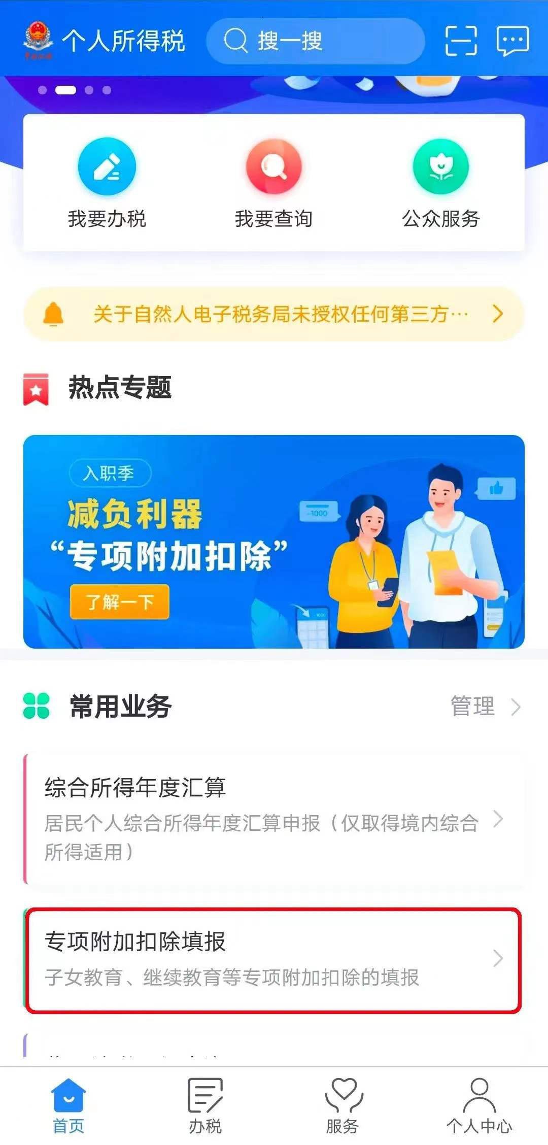 1、打开“个人所得税”APP,注册并登录,选择“首页”—“专项附加扣除填报”