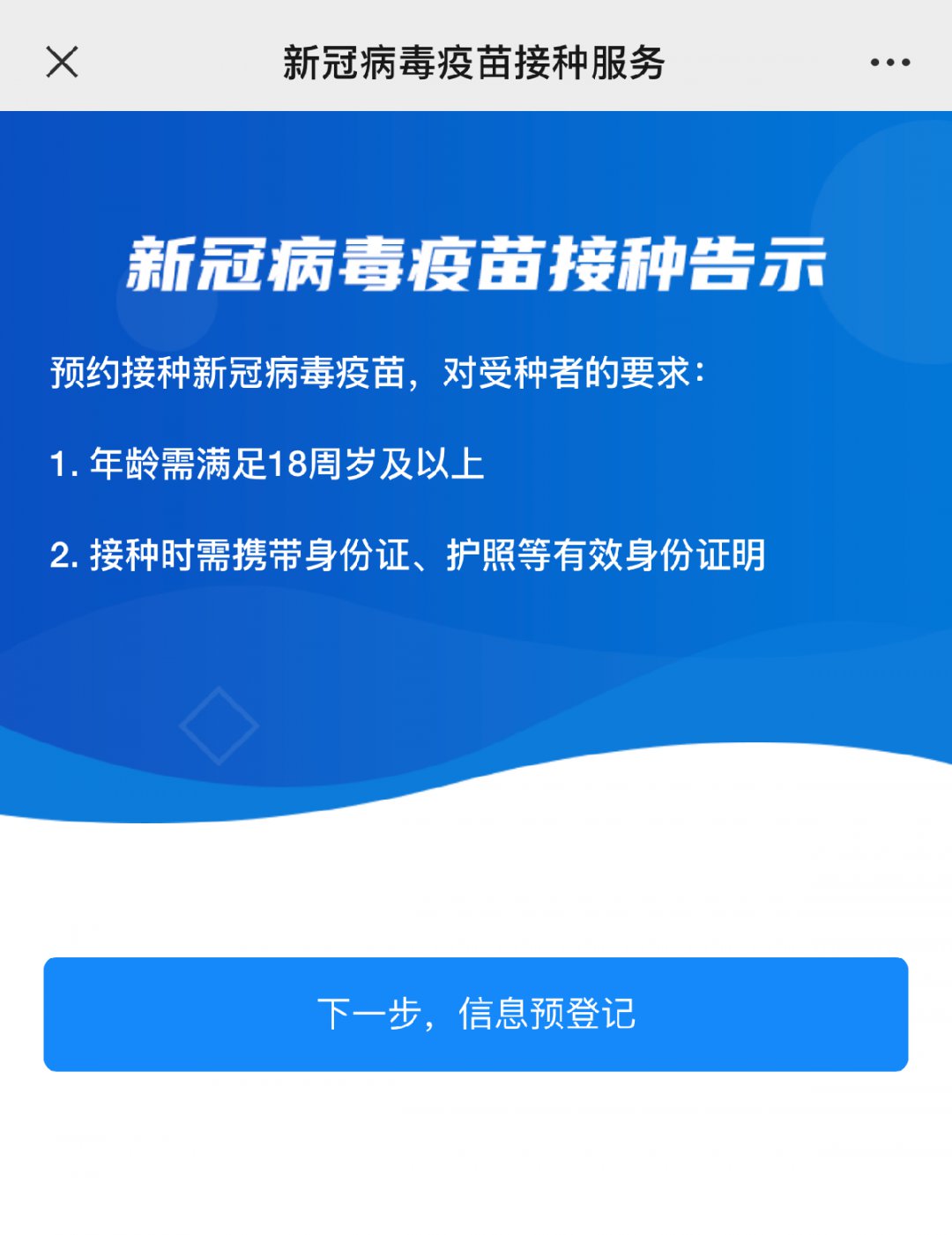 (2) 阅读“新冠疫苗接种告示”,并进行个人信息预登记。
