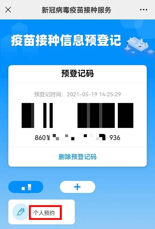 (3) 完成疫苗接种信息预登记后,生成预登记码,点击“个人预约”并查看新冠病毒疫苗接种注意事项。