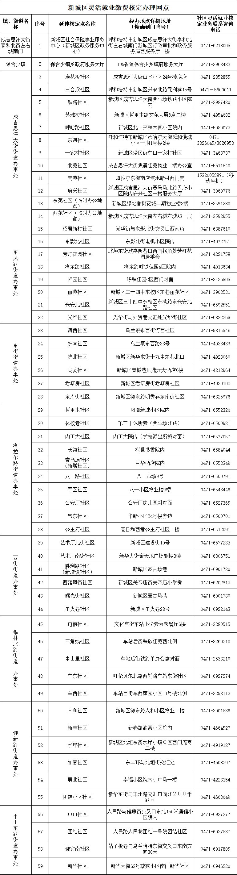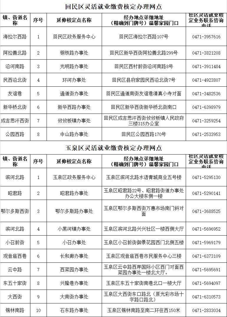 呼和浩特市各区灵活就业人员缴费核定办理网点