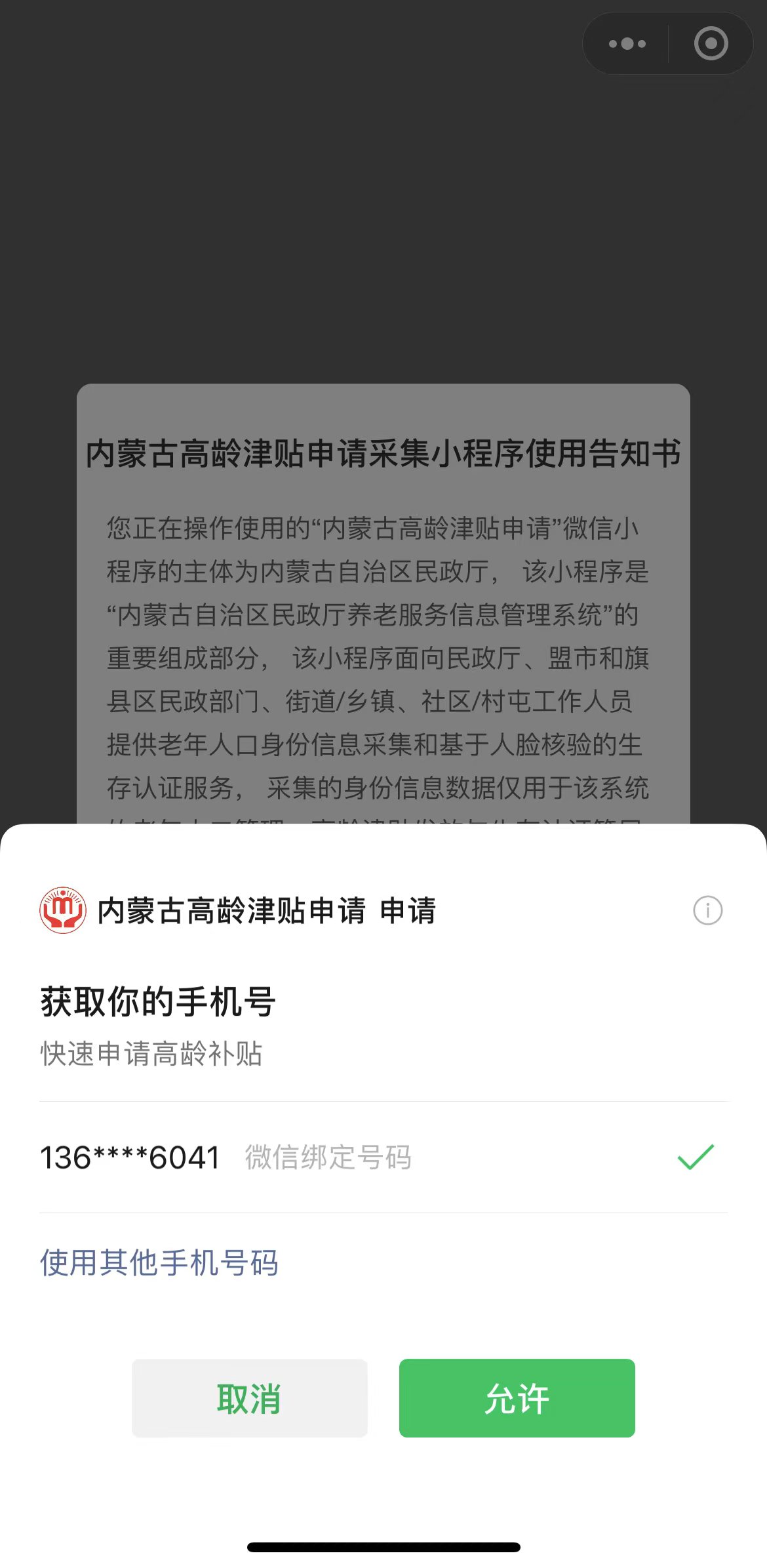 2.同意“内蒙古高龄津贴申请采集小程序使用告知书”;