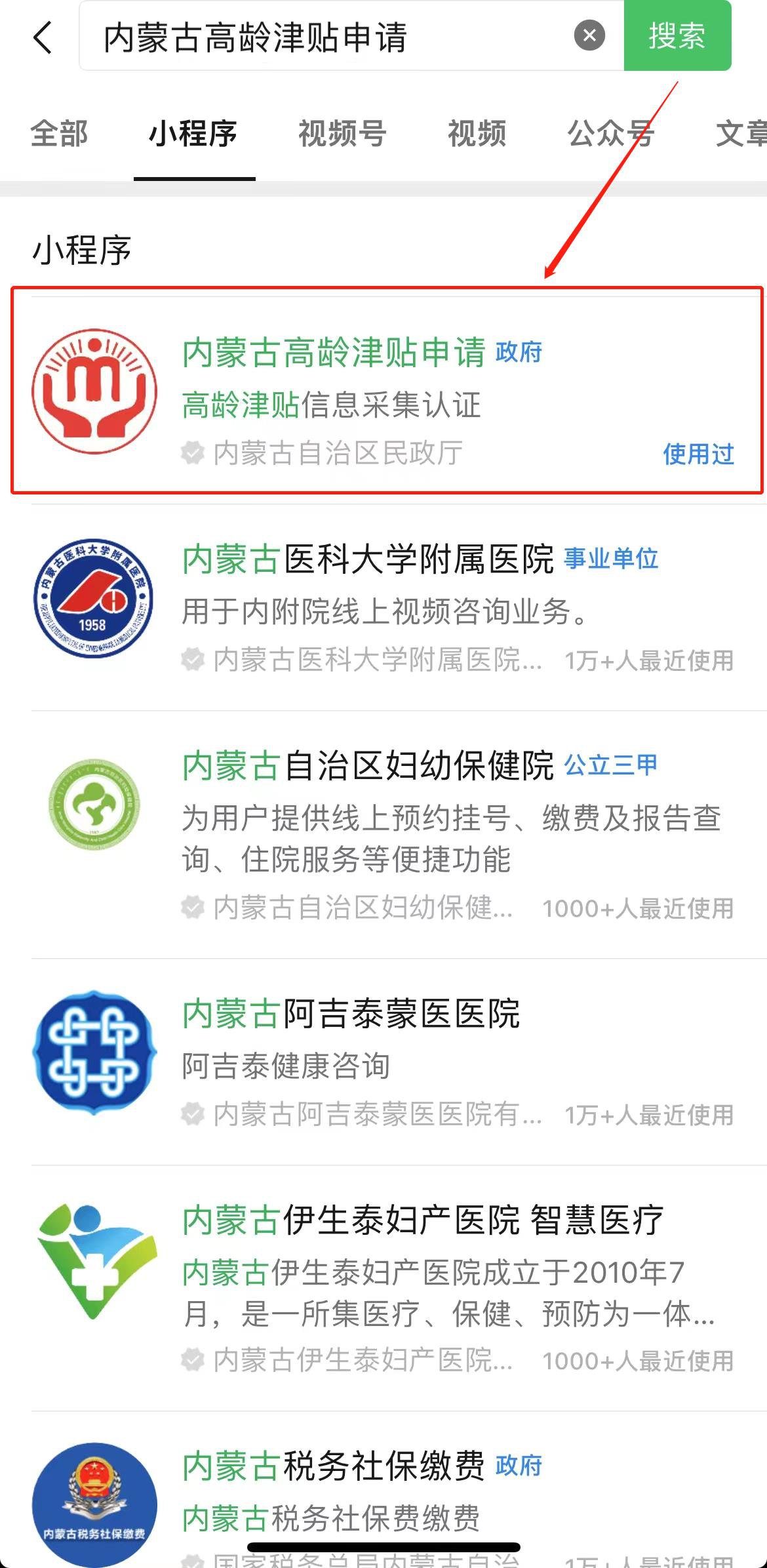 1.在微信搜索“内蒙古高龄津贴申请”小程序,点击进入;