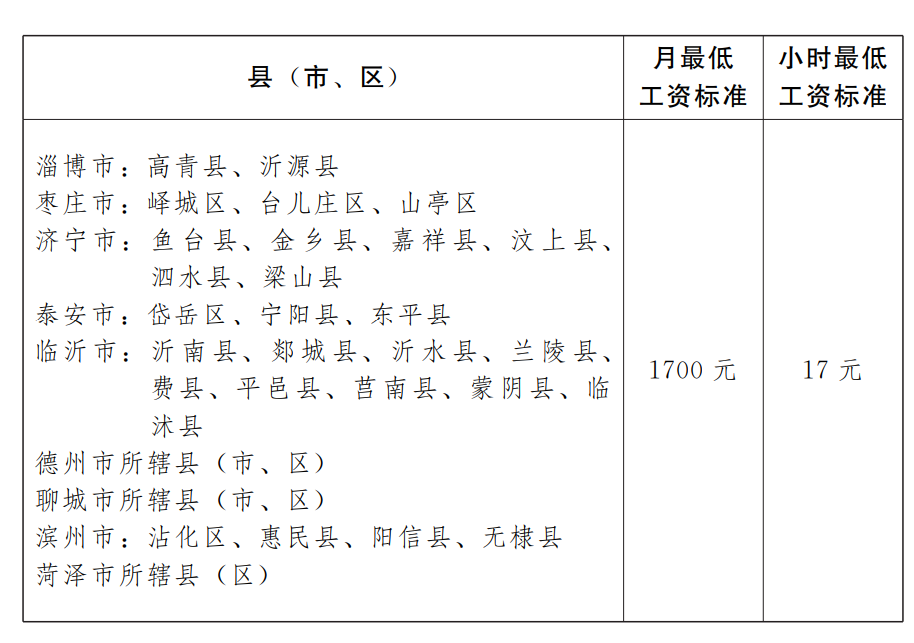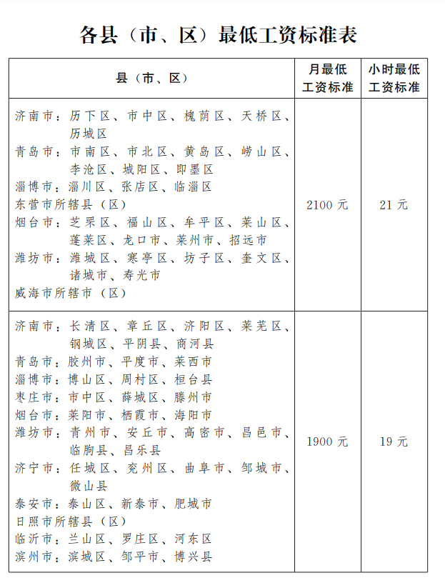 一、调整后的全省月最低工资标准为2100元、1900元、1700元;小时最低工资标准为21元、19元、17元。各县(市、区)最低工资标准见附件。