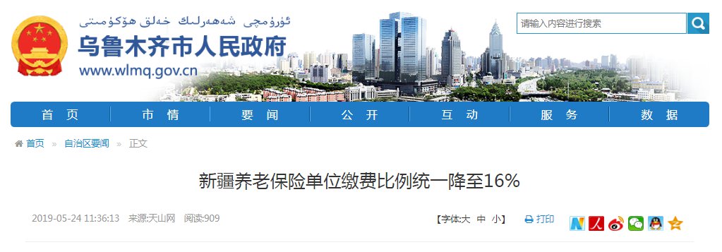 2019年5月1日起,新疆城镇职工基本养老保险单位缴费比例统一降至16%。