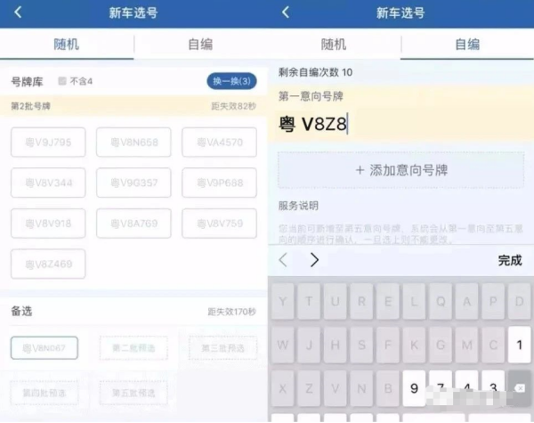 二、选号方式有两种,一种是随机选号,一种是自编选号,随机选号和自编选号这两种选号方式无先后顺序。点击“自编”即可自己编辑车牌号码,自编选号总共可以自编20个号牌号码,可同时录入5个意向号牌,系统会按照录入顺序依次验证,注意把最心仪的号牌录在第一个。