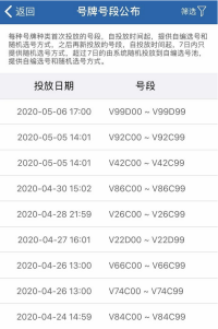 车主可以先通过页面的号段公布字样,点击进入可查看近期投放的号段。