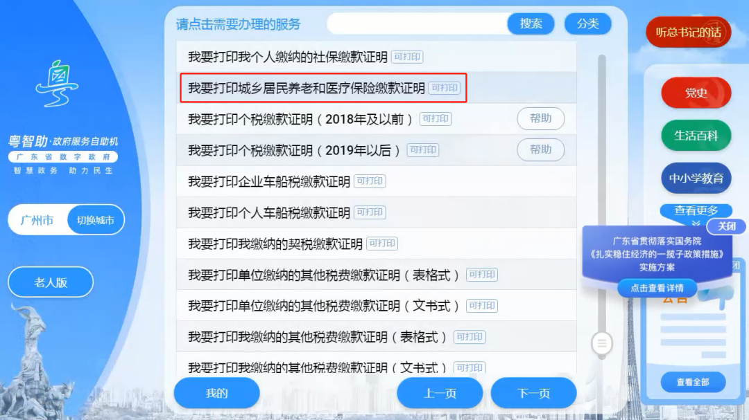 答:在粵智助政府服务自助机首页滑动或搜索关键词,点击“我要打印城乡居民养老和医疗保险缴款证明”,刷身份证等方式进行验证登录,选择税款所属期起止时间,确认缴费明细信息即可打印缴款证明。