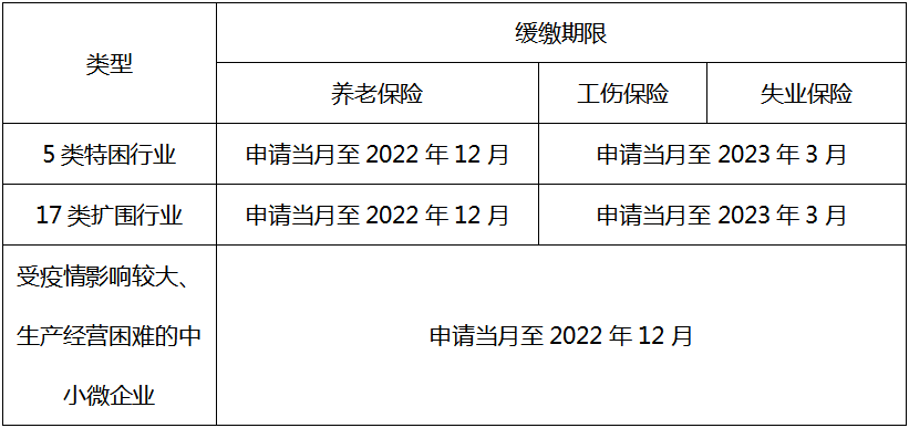备注:17类扩围行业和受疫情影响较大、生产经营困难的中小微企业,申请需要满足2022年度连续三个月累计为亏损状态,且申请缓缴时处于正常缴费状态。