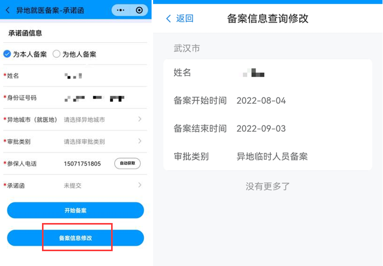 备案成功后,在个人基本信息页输入手机号后点击“备案信息查询修改”按钮,显示已提交的异地备案基础信息。
