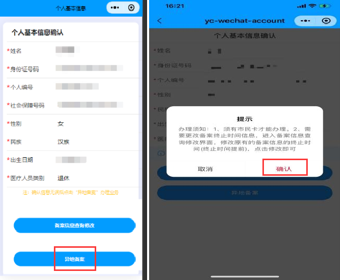 确认个人基本信息后点击“异地备案”,确认备案时间,点击“确认新增”,显示“操作成功”,备案就完成了。