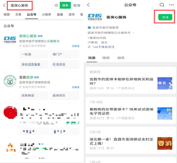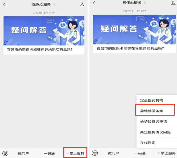 (2)方式二:关注微信公众号“医保心服务”,在掌上服务选择“异地就医备案”。