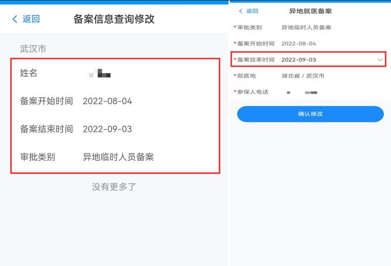 点击数据可查询详细异地备案信息,其中备案结束时间可以进行修改,点击后方“ˇ”按钮重新选择时间确认后,点击“确认修改”按钮即可修改备案结束时间。