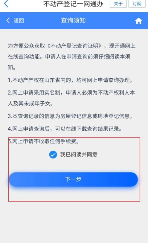 4、阅读查询须知并勾选“我已阅读并同意”,点击下一步