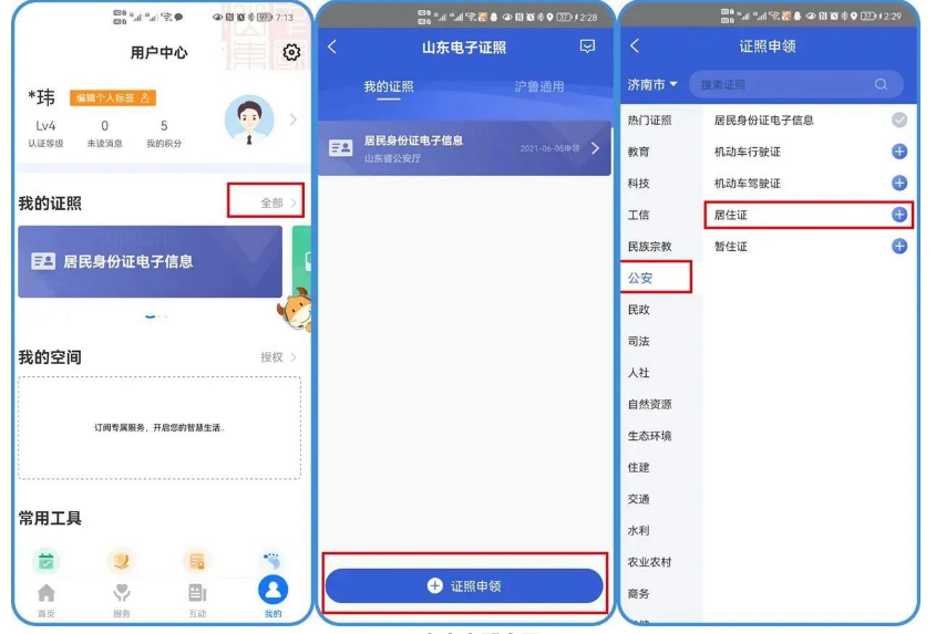第二步:通过首页-我的证照与已经申请领居住证关联。