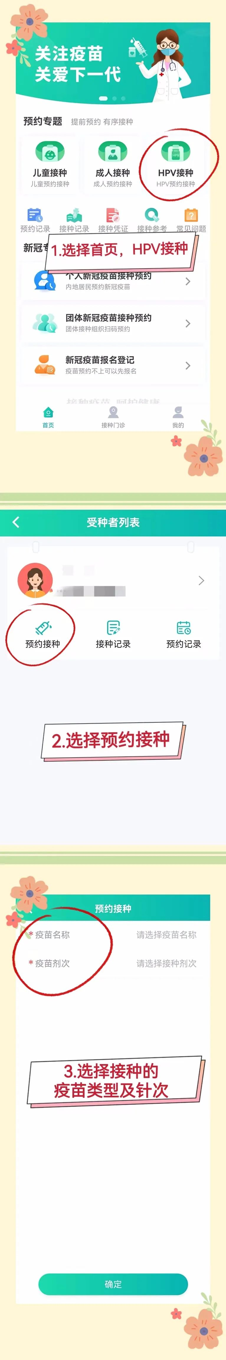 认证成功后,点击【首页】进入预约页面,点击【HPV疫苗预约】选择【预约接种】,然后选择预约的疫苗类型【双价人乳头瘤病毒疫苗(大肠杆菌)】及预约的针次。