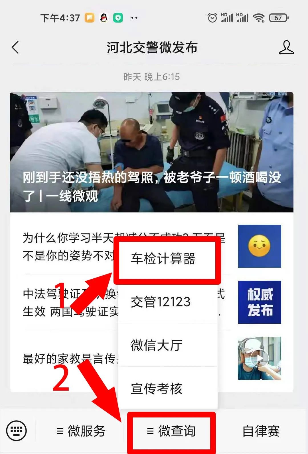 关注“河北交警微发布”使用功能菜单【微查询】点击【车检计算器】;