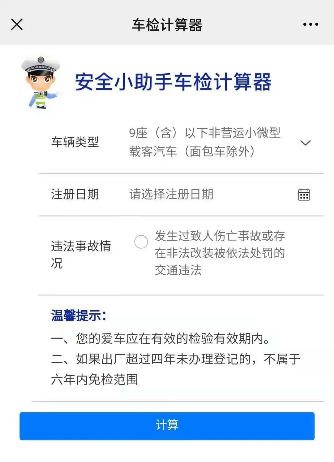 “车检计算器”小程序使用指南: