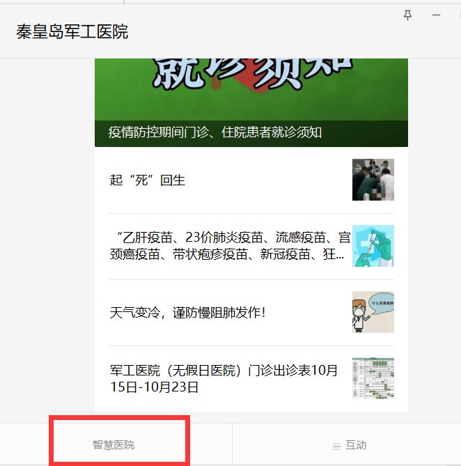 1、秦皇岛军工医院实行网上预约挂号,可在微信搜索公众号“秦皇岛军工医院”(点击此处扫描二维码)、点击“关注”、点击“智慧医院”、点击“预约挂号”、点击“按科室预约/按专家预约”、选择“就诊科室/专家及时间段”,按所选时间来院就诊,节省排队等待时间。