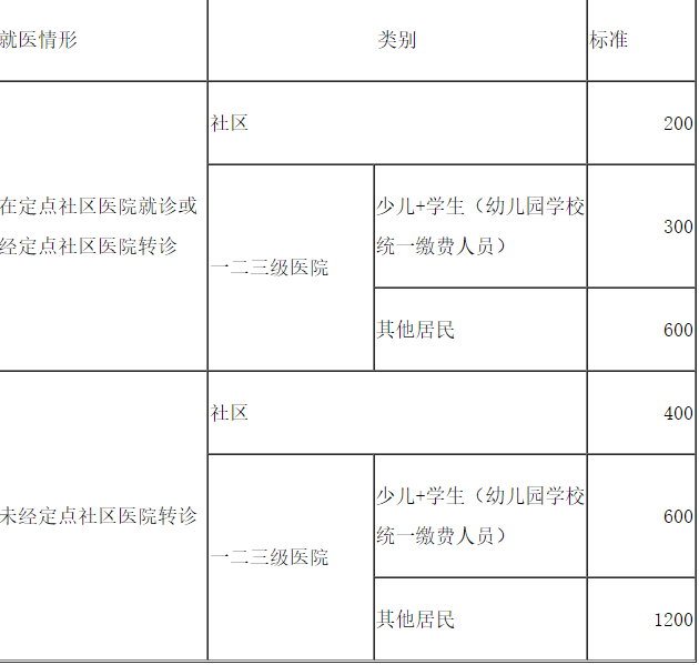 1、应在社区卫生服务中心首诊,住院医疗费用起始费为200元,符合规定的医疗费用基金支付90%,个人自付10%;