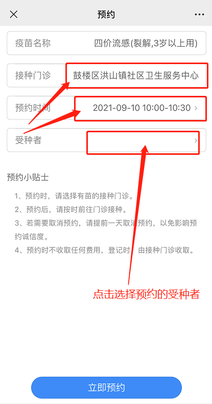在预约界面选择接种门诊、预约时间、需要预约接种的受种者;