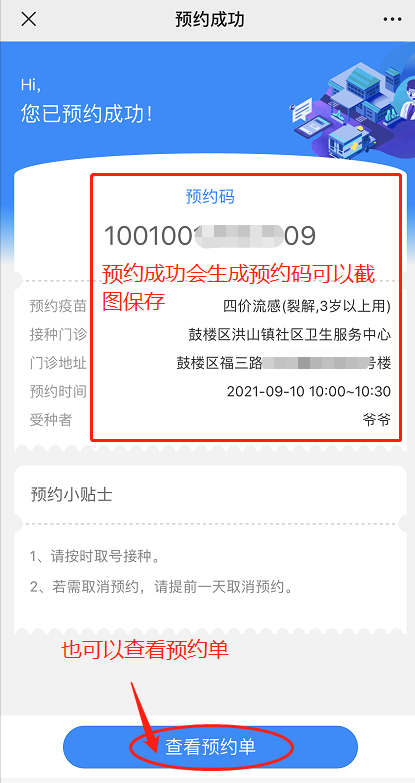 预约成功后,会生成预约码,可以截图保存;临时有事也可以通过查看预约单来取消预约;