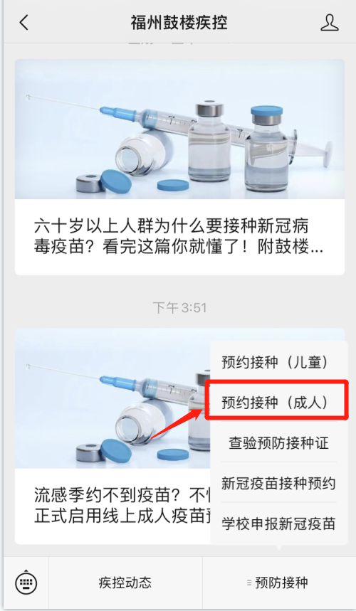 用户在微信关注“福州鼓楼疾控”公众号后,点击菜单栏的【预防接种】中的【预约接种(成人)】子栏目,进入系统。