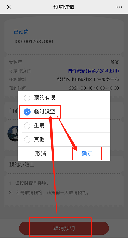 点击【取消预约】——选择原因——点击【确定】;