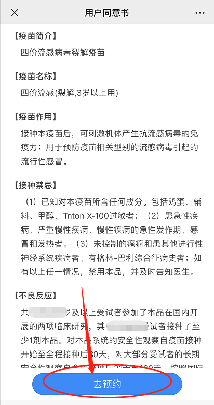 先进行同意书的阅读,具体以门诊接种时签署的为准,阅读完毕后点击【去预约】;