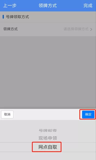 步骤六:点击【领牌方式】,选择“网点自取”方式,点击【确定】,点击【领牌网点】,选择相应的网点后点击【确定】。
