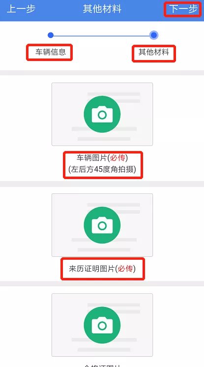 步骤五:上传车辆图片,来历图片,合格证图片,ccc认证证书图片,点击【下一步】。(注:备案类型选择“本人车辆”且购买日期选择“2019年4月15日后(含)”才需提交CCC认证证书图片)。