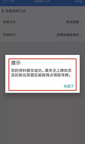 步骤七:确定“领牌方式”与“领取网点”无误,点击【完成】,即可完成业务申请。